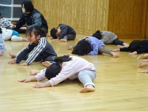 まずは柔軟体操で体をほぐします。